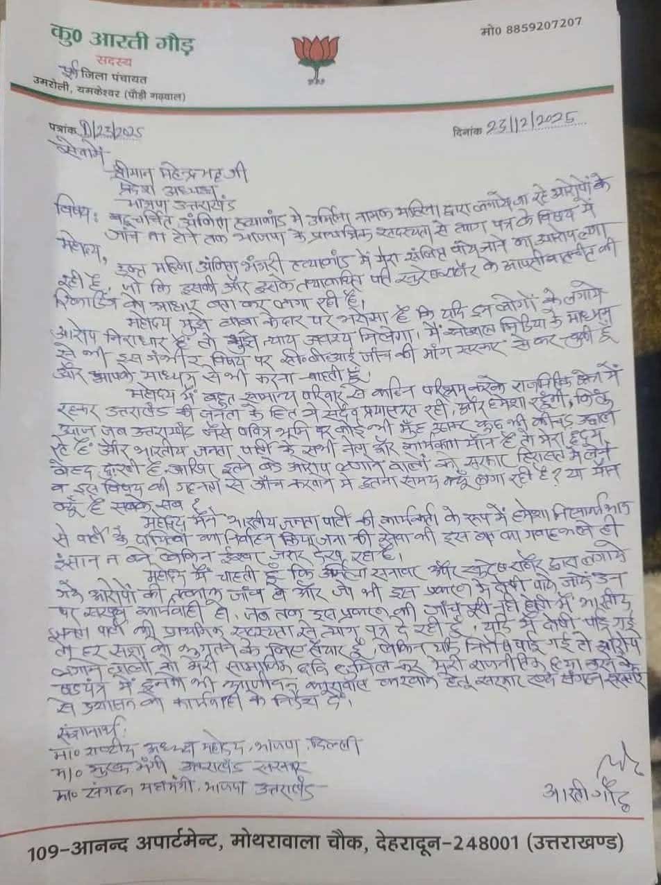 यमकेश्वर की पूर्व जिला पंचायत सदस्य आरती गौड़ ने भाजपा की प्राथमिक सदस्यता से इस्तीफा दे दिया। उन्होंने सरकार से अंकिता हत्याकांड की सीबीआई जांच की मांग करते हुए कहा कि उनके खिलाफ गंभीर आरोप लगाए गए हैं और सरकार की निष्क्रियता से आहत होकर उन्होंने यह फैसला लिया है।