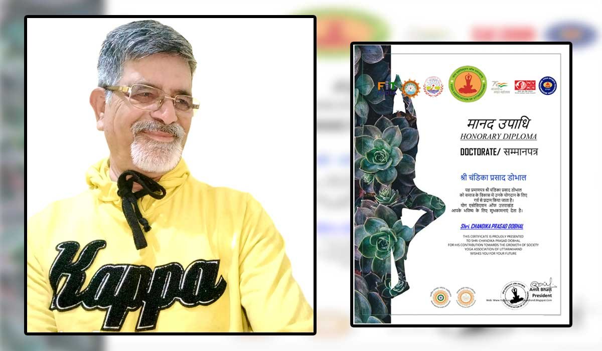 ऐसी प्रतिभा को उत्तराखंड योगा एसोसिएशन के अध्यक्ष अमित भट्ट द्वारा गत दिवस मानद उपाधि प्रदान कर गोरवान्वित किया गया। वन विभाग में निरंतर 36 साल सर्वेयर के पद पर सेवा देने वाले देहरादून वन प्रभाग से सेवा निवृत हुए चंडिका प्रसाद डोभाल को उनके सामाजिक कार्यों के लिए व स्वस्थ बनाए रखने के लिए योग को आगे बढ़ाने में योगदान के लिए उत्तराखंड योग एसोशिएशन ने मानद उपाधि देकर सम्मानित किया।
